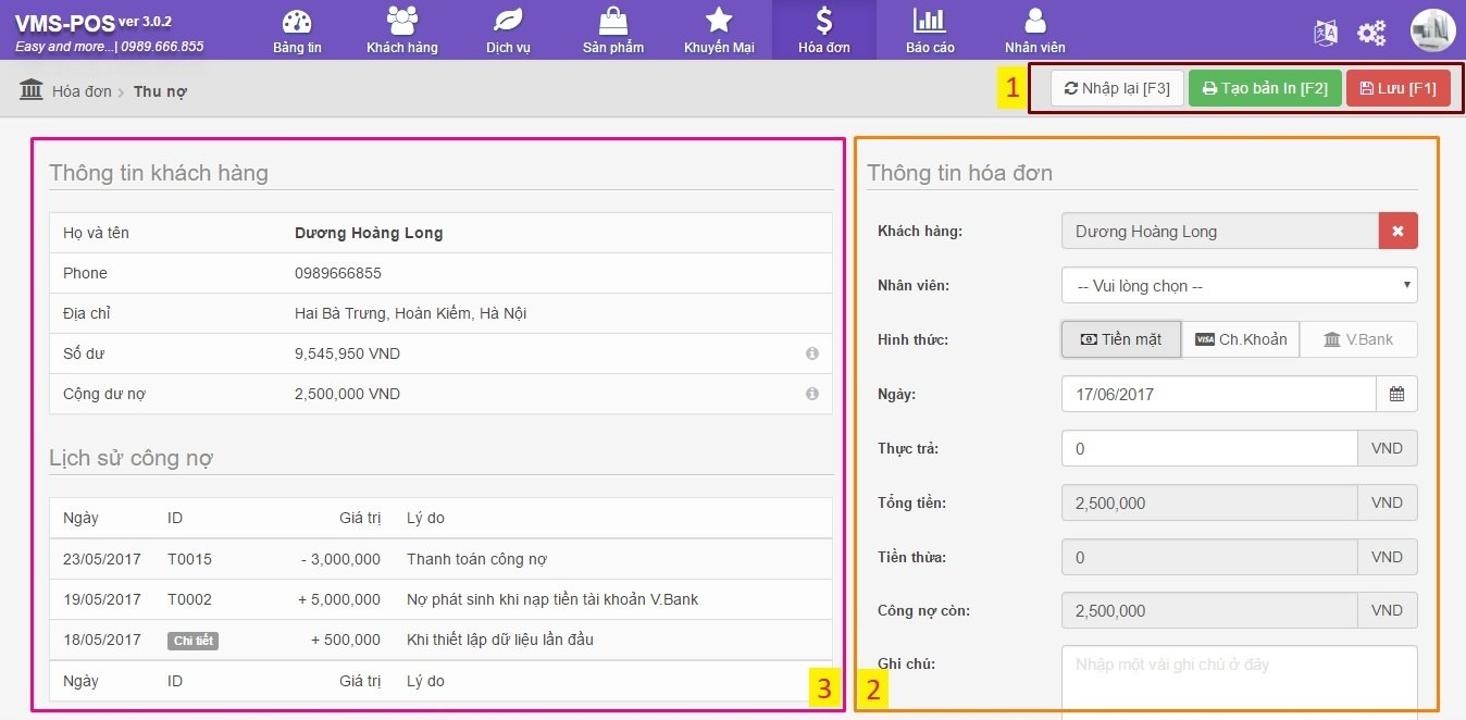 - Tổng tiền: Tổng giá trị công nợ của khách hiện tại
