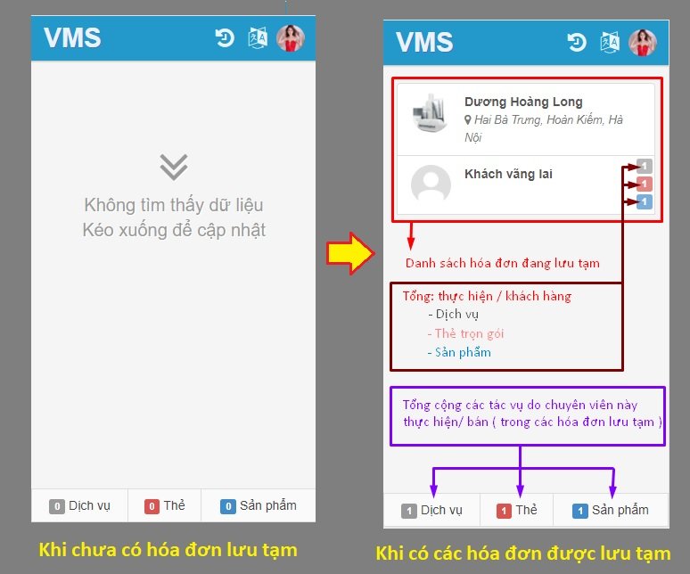 Bên trái là giao diện khi chưa có hóa đơn lưu tạm