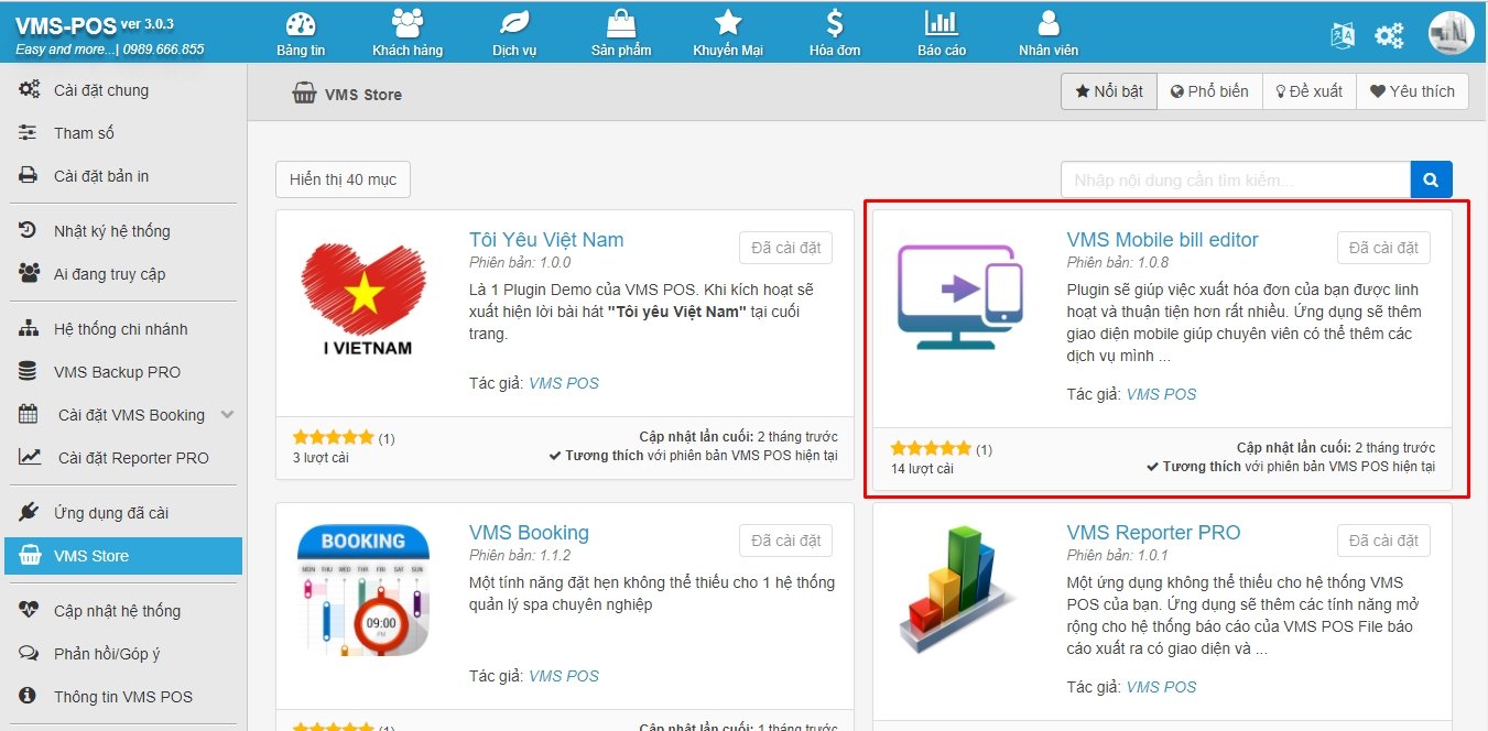 Xem hướng dẫn cài đặt thêm các ứng dụng tại VMS Store ( tích hợp ). Sử dụng từ khóa VMS Mobile bill editor để tìm kiếm